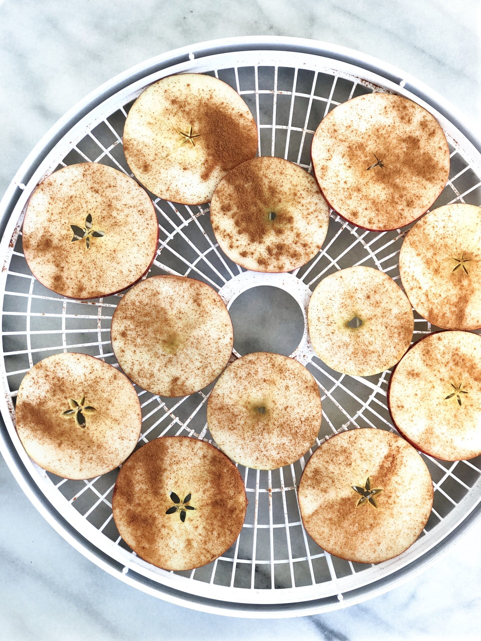- Arrange apple slices on a dehydrator tray or on a lined baking sheet