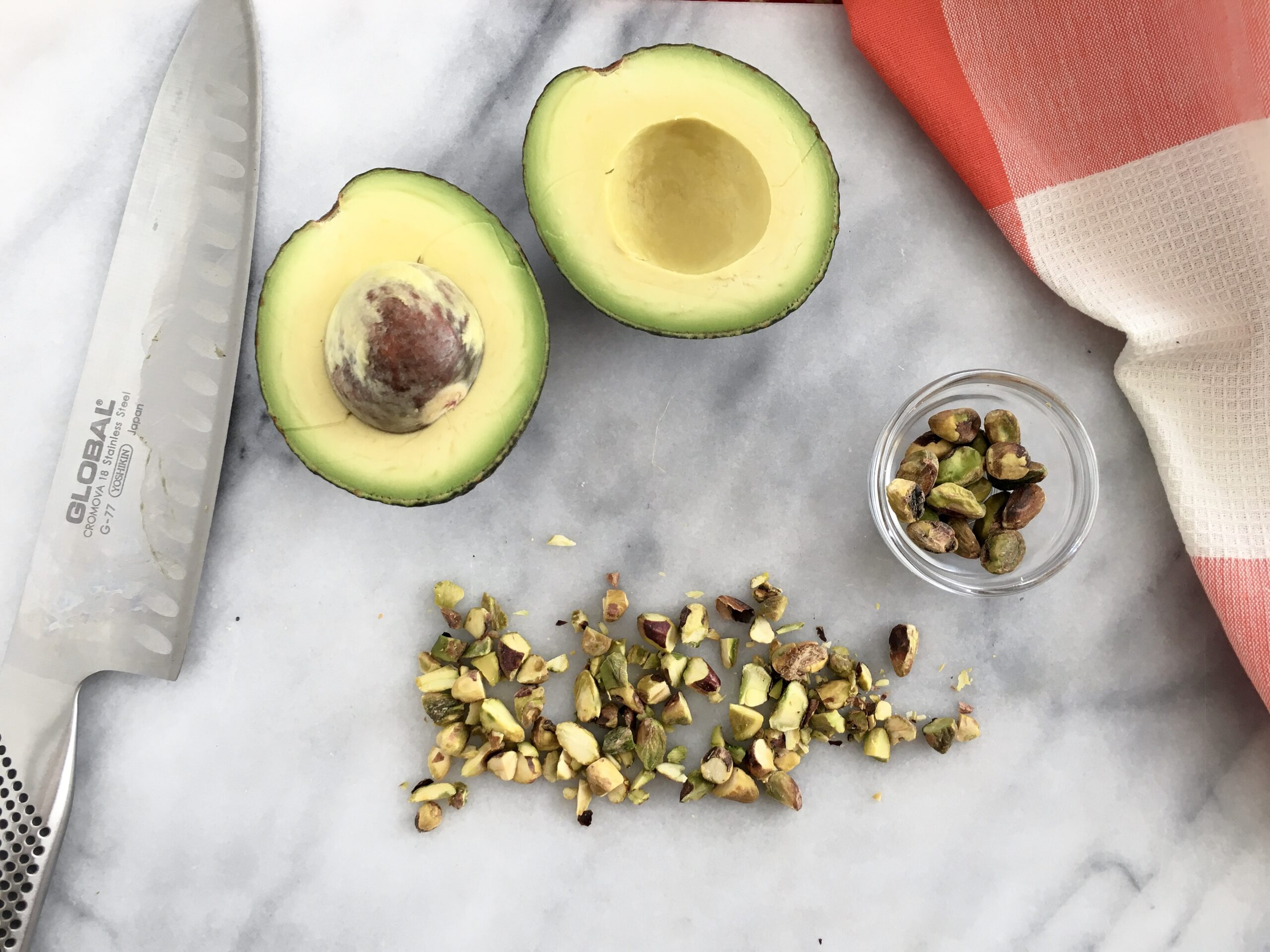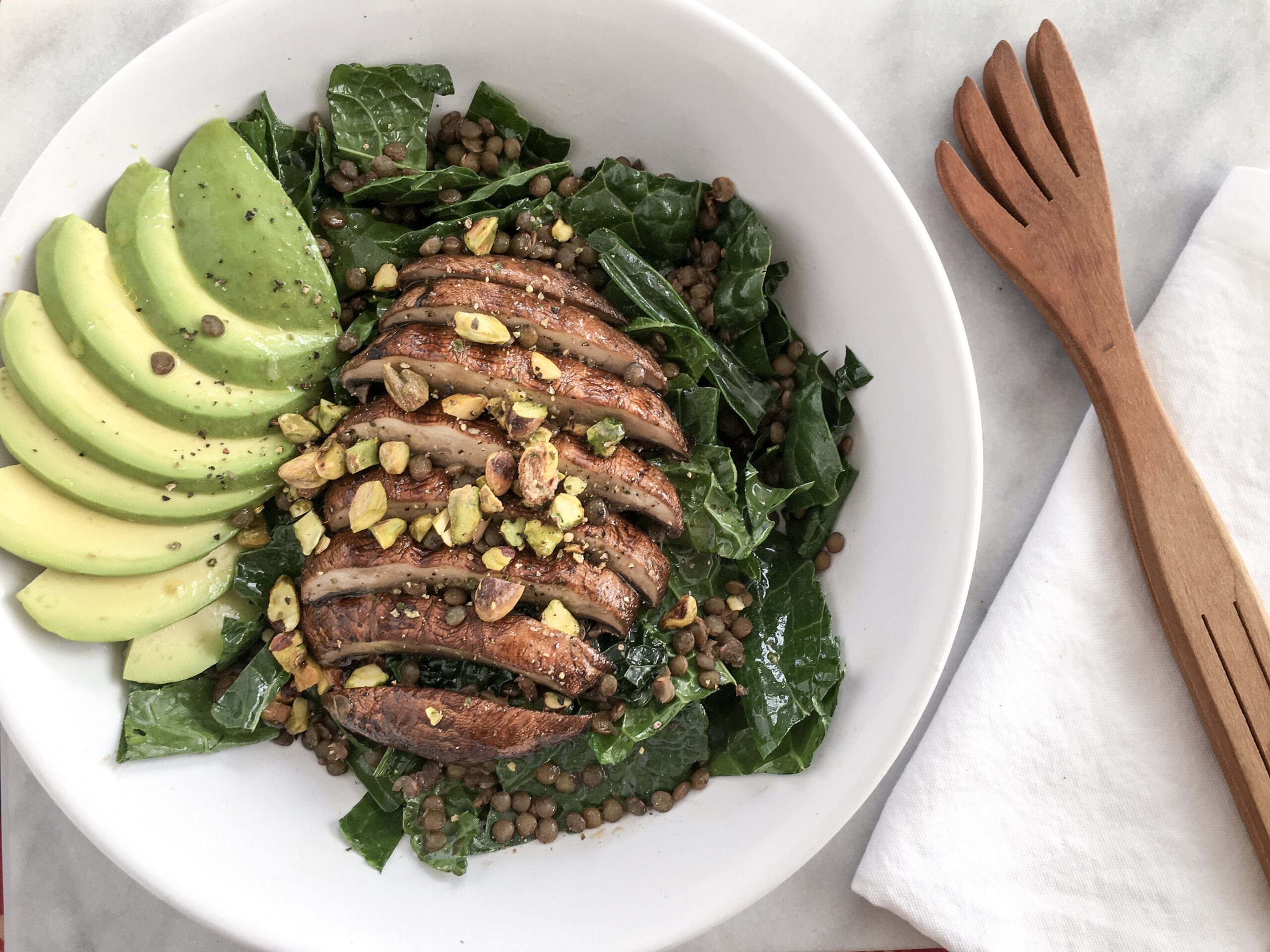 - Sprinkle lentils and pistachios into kale. Slice avocado and toss into salad.