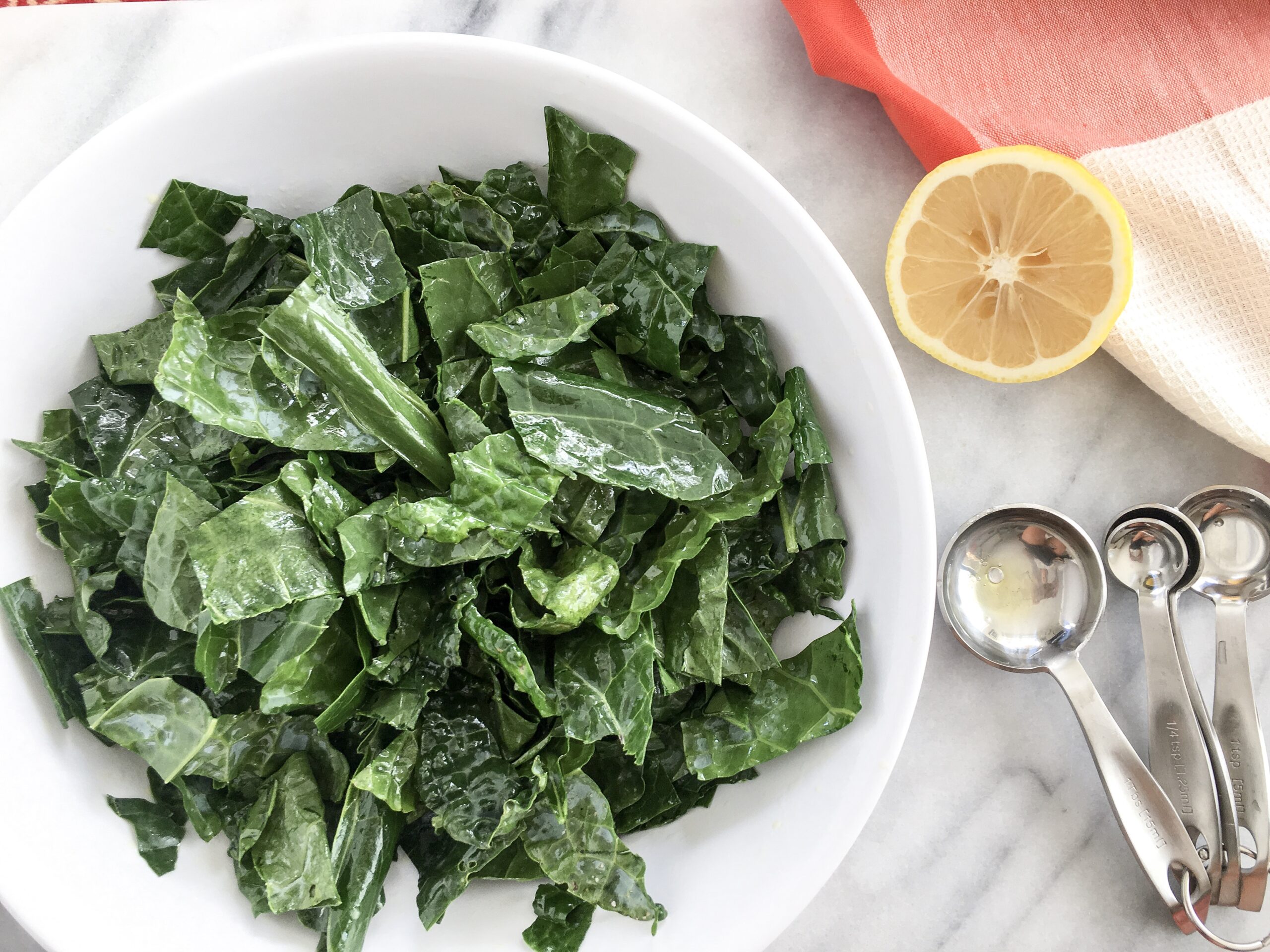 - Pour half of the dressing on the kale. Massage with your hands for 1 minute, evenly distributing the dressing on leaves.