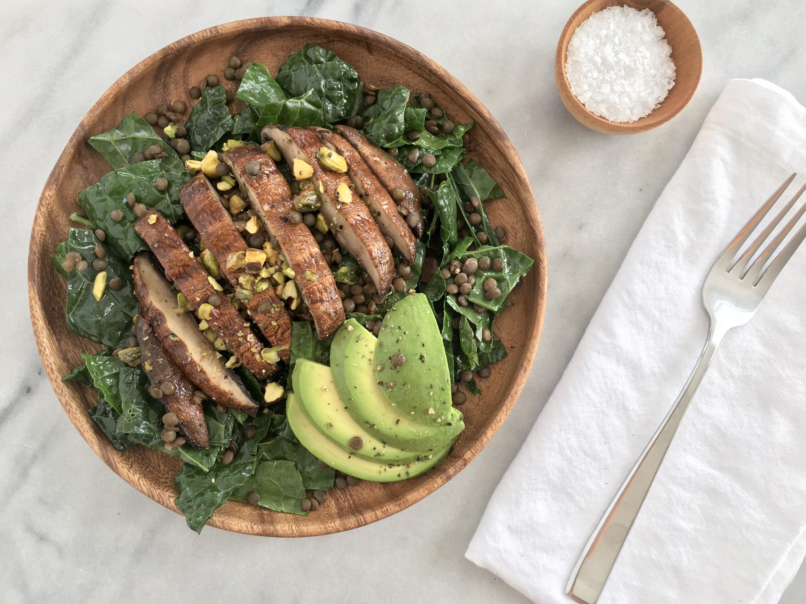 - Sprinkle lentils and pistachios into kale. Slice avocado and toss into salad.