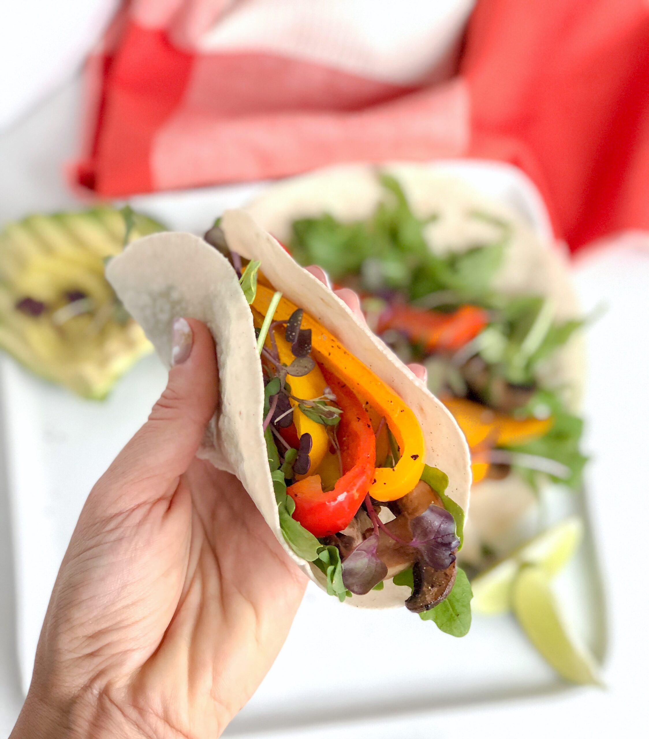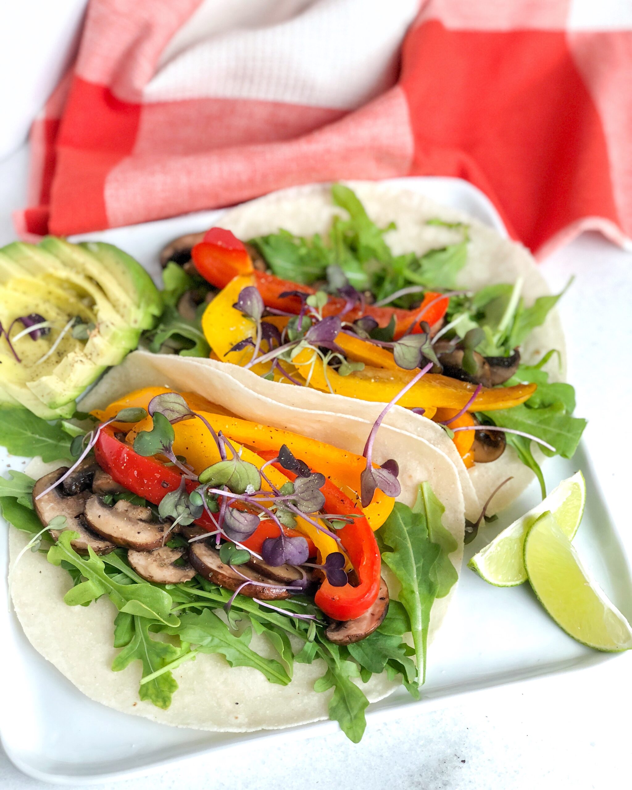 - Place peppers and mushrooms on greens, repeating for each taco
