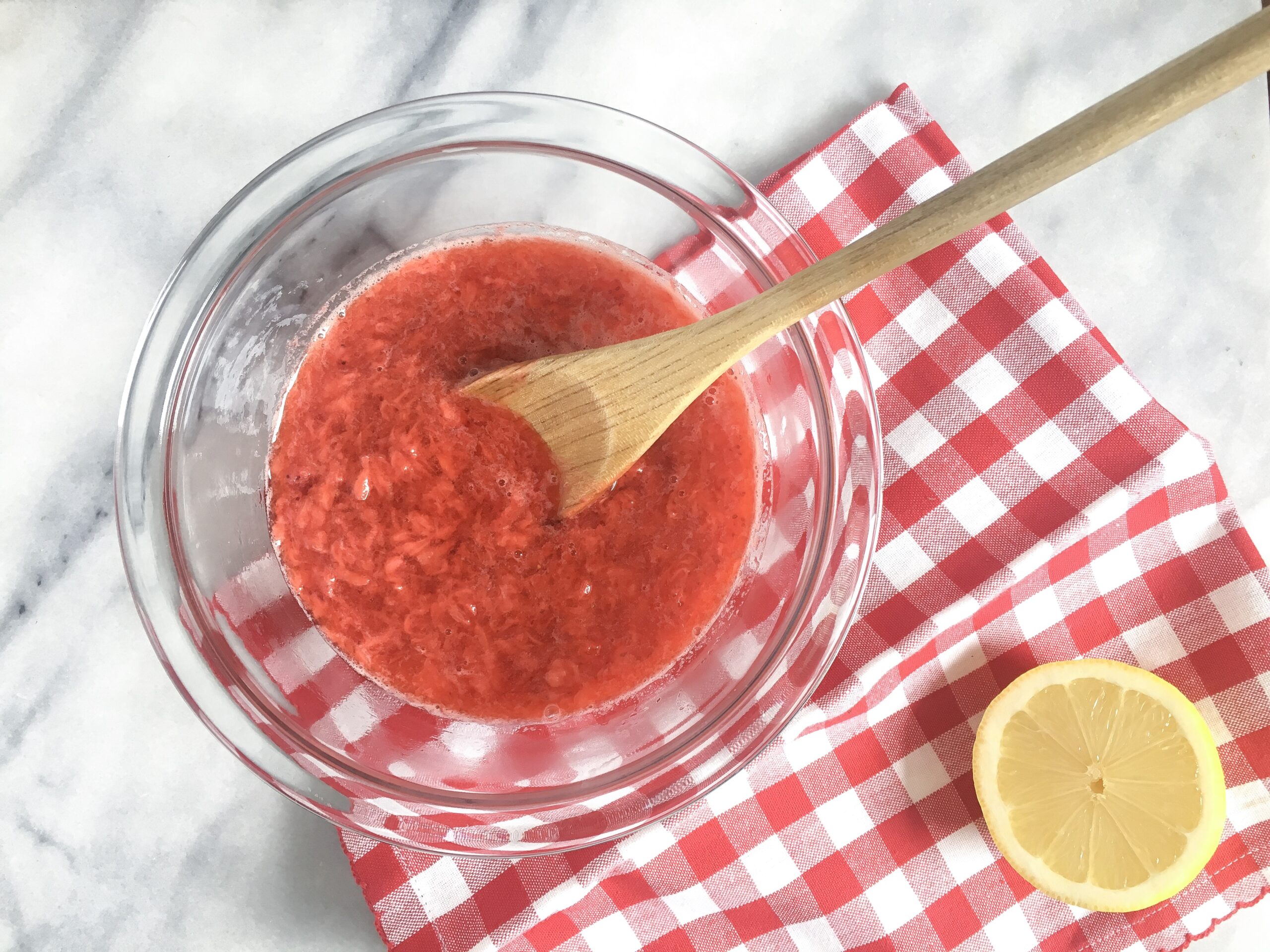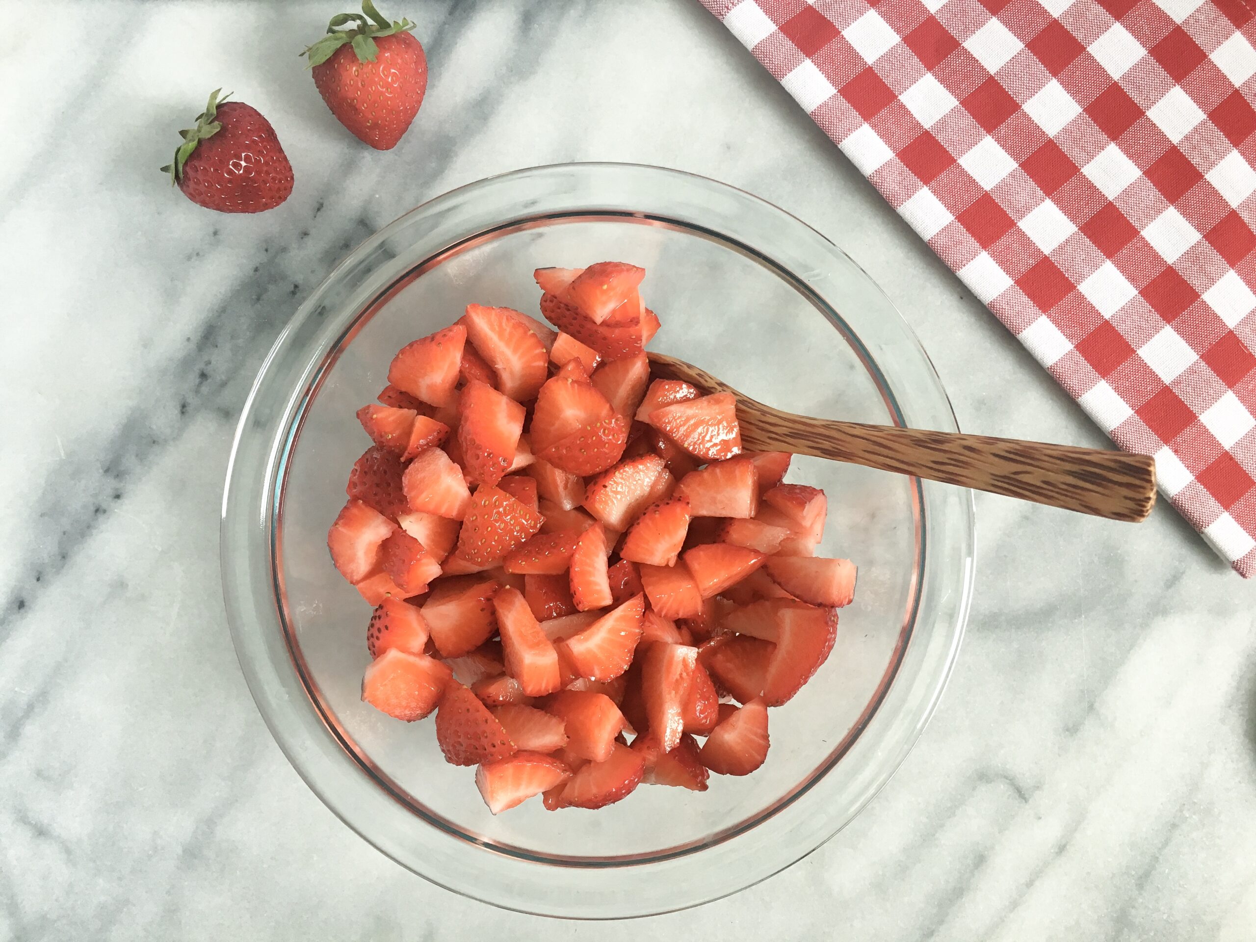- De-stem and chop strawberries into smaller pieces