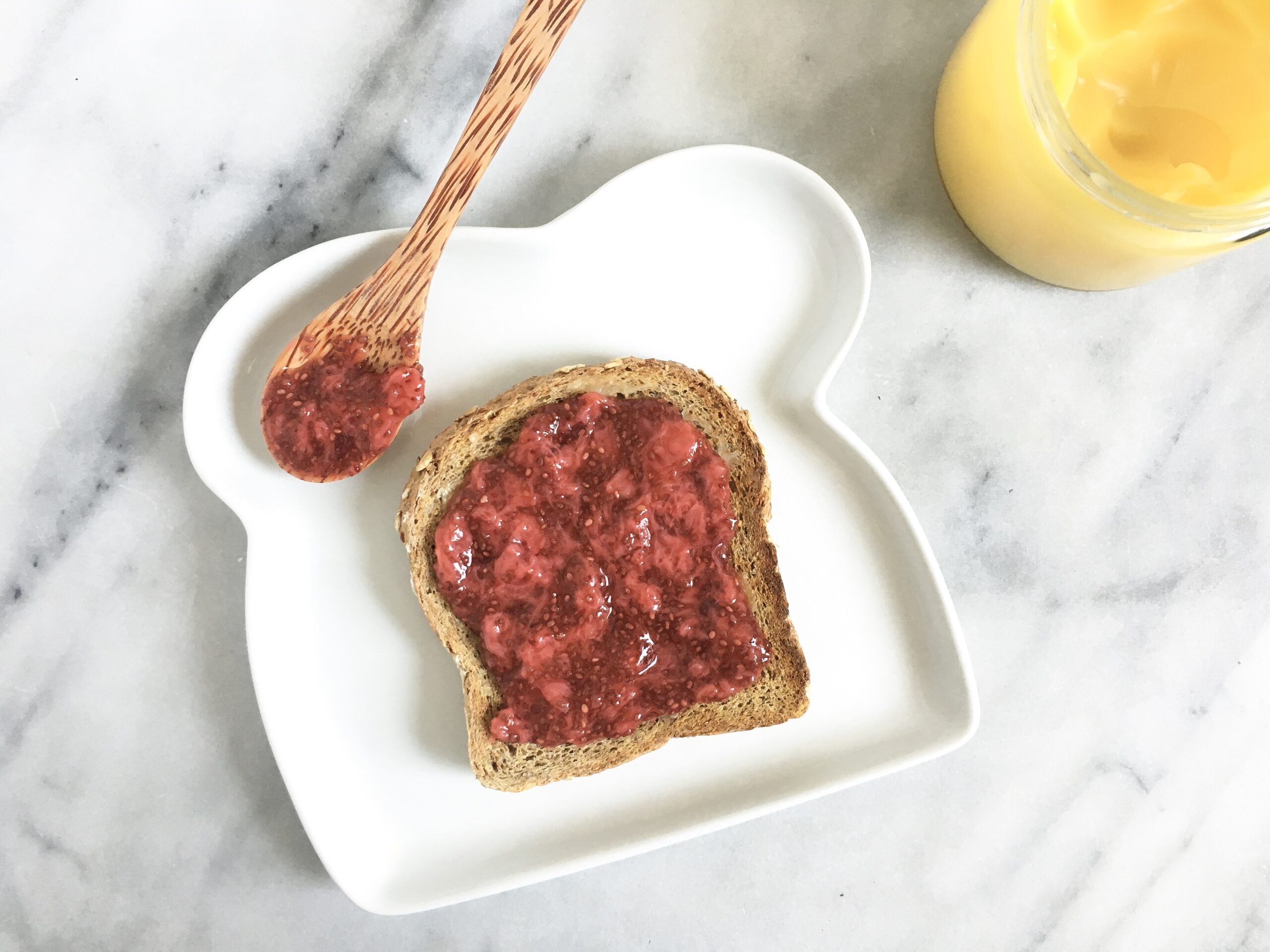 After some research and trial and error, I ended up with this simple recipe that I love for several reasons. It’s super simple to make (15 minutes tops) and produces just the right amount considering it only lasts for 2-3 weeks in your fridge. I also love that it doesn’t need any added sweetener, but you can add honey or your preferred sweetener if you like your jam a little sweeter. Plus, I amped up the amount of chia seeds to boost the protein, fiber and that telltale crunch – you’re welcome.