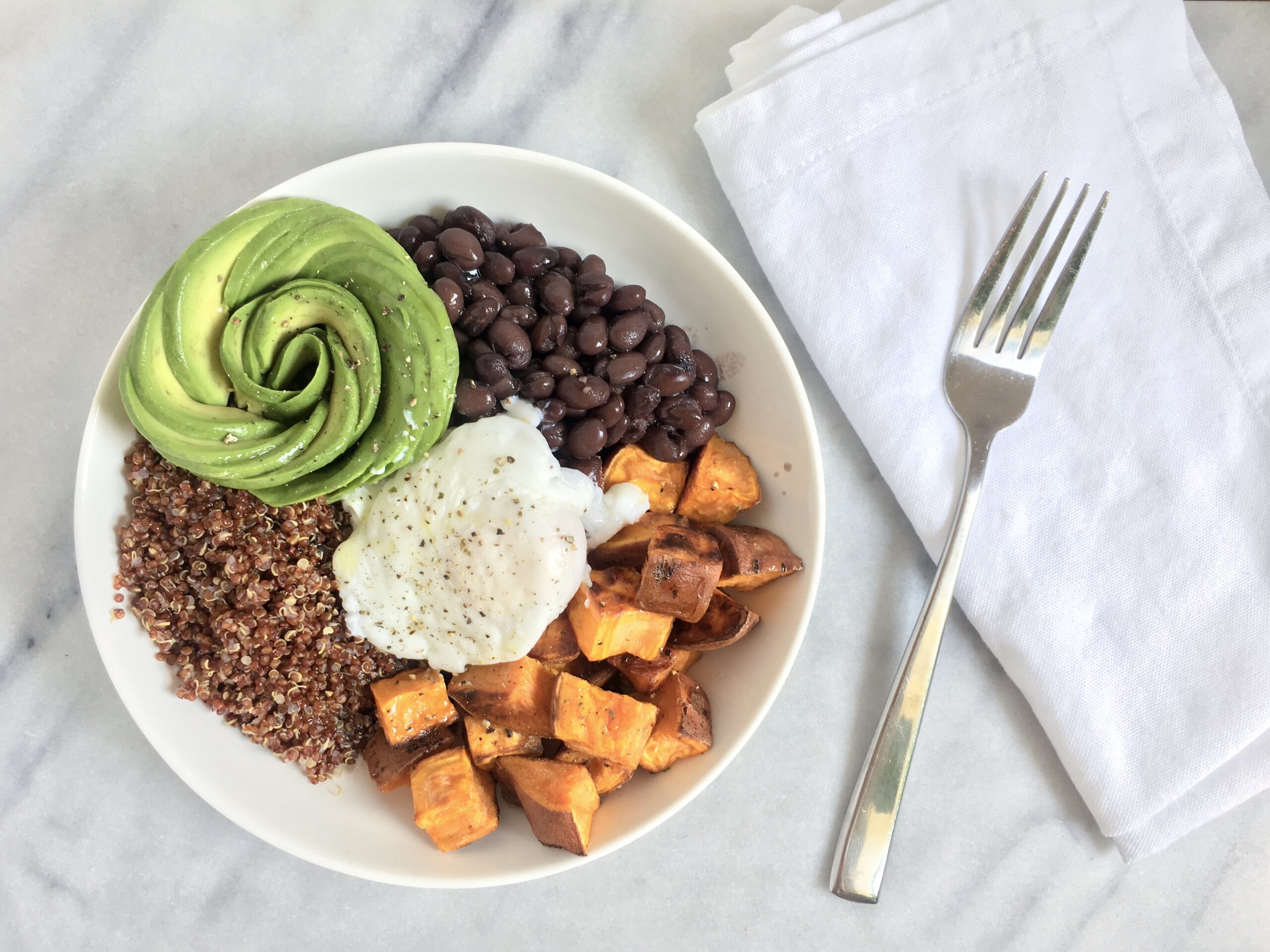 We’re a big quinoa, sweet potato and black bean home, so when I decided to put them all together in a bowl with avocado and a gooey poached egg, I knew it was going to be a winner. The first time I made this, I kid you not, my husband ate it in 1 minute and immediately asked when I would be making it again. Lucky for him, this is a simple recipe and it’s perfect for Sunday meal prepping. I like to make a big batch and store it in individual Tupperware’s in the fridge to reheat and eat throughout the week – just don’t forget to add fresh avocado every time.