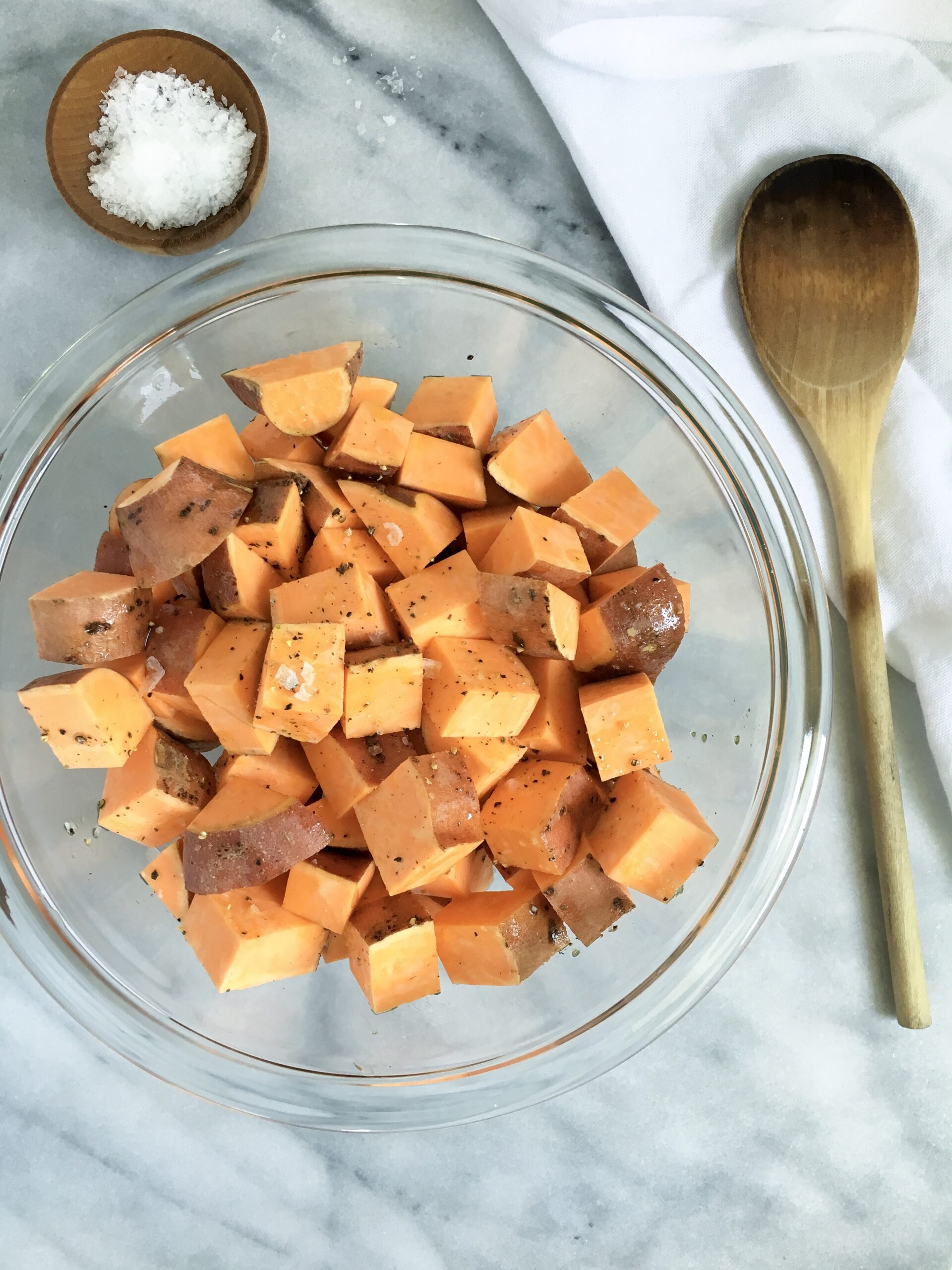 - Place sweet potatoes in a large bowl and coat evenly with olive oil, salt, and pepper