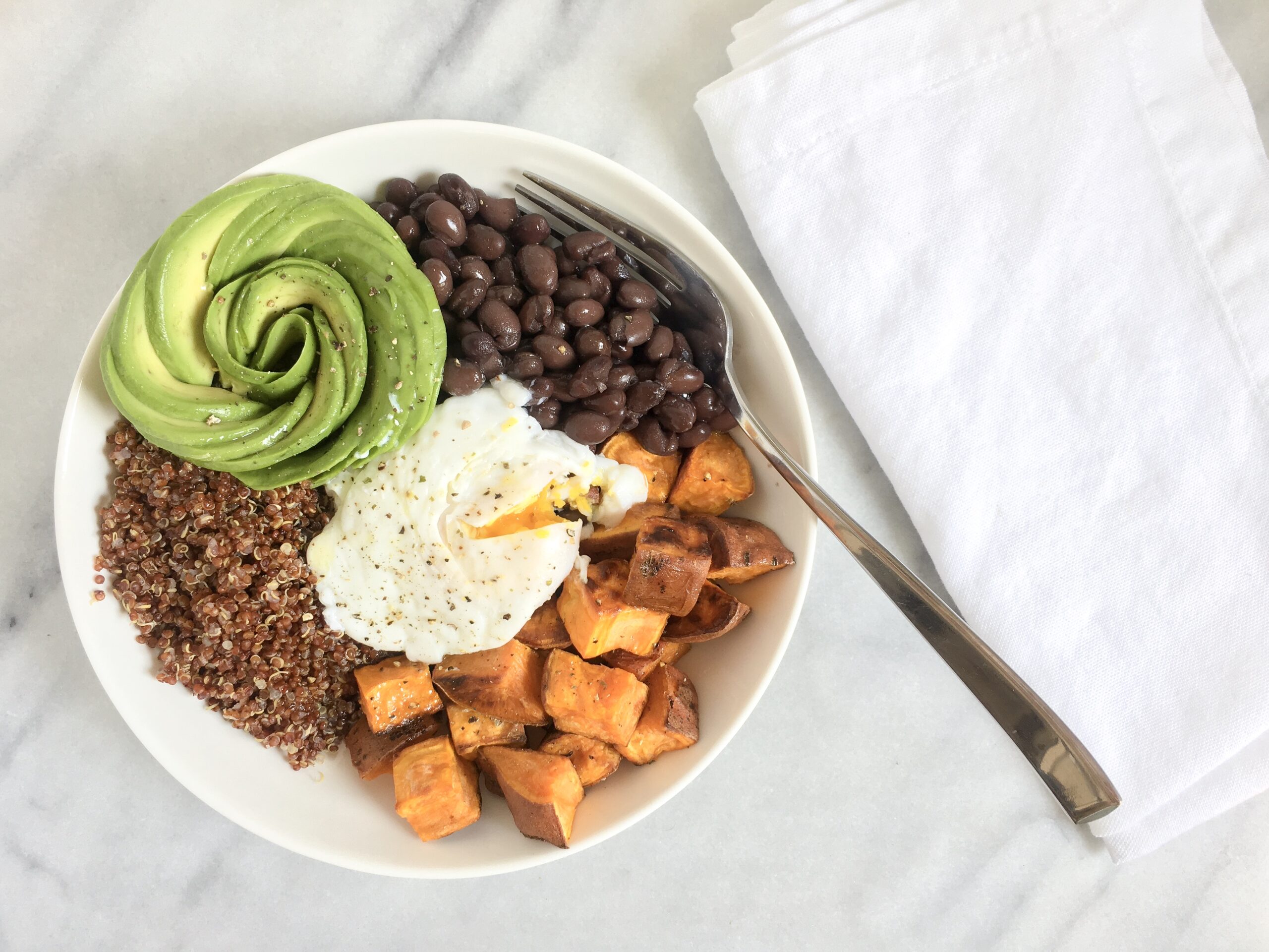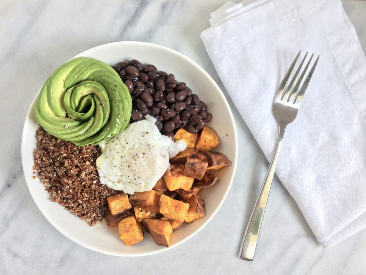 We’re a big quinoa, sweet potato and black bean home, so when I decided to put them all together in a bowl with avocado and a gooey poached egg, I knew it was going to be a winner. The first time I made this, I kid you not, my husband ate it in 1 minute and immediately asked when I would be making it again. Lucky for him, this is a simple recipe and it’s perfect for Sunday meal prepping. I like to make a big batch and store it in individual Tupperware’s in the fridge to reheat and eat throughout the week – just don’t forget to add fresh avocado every time.