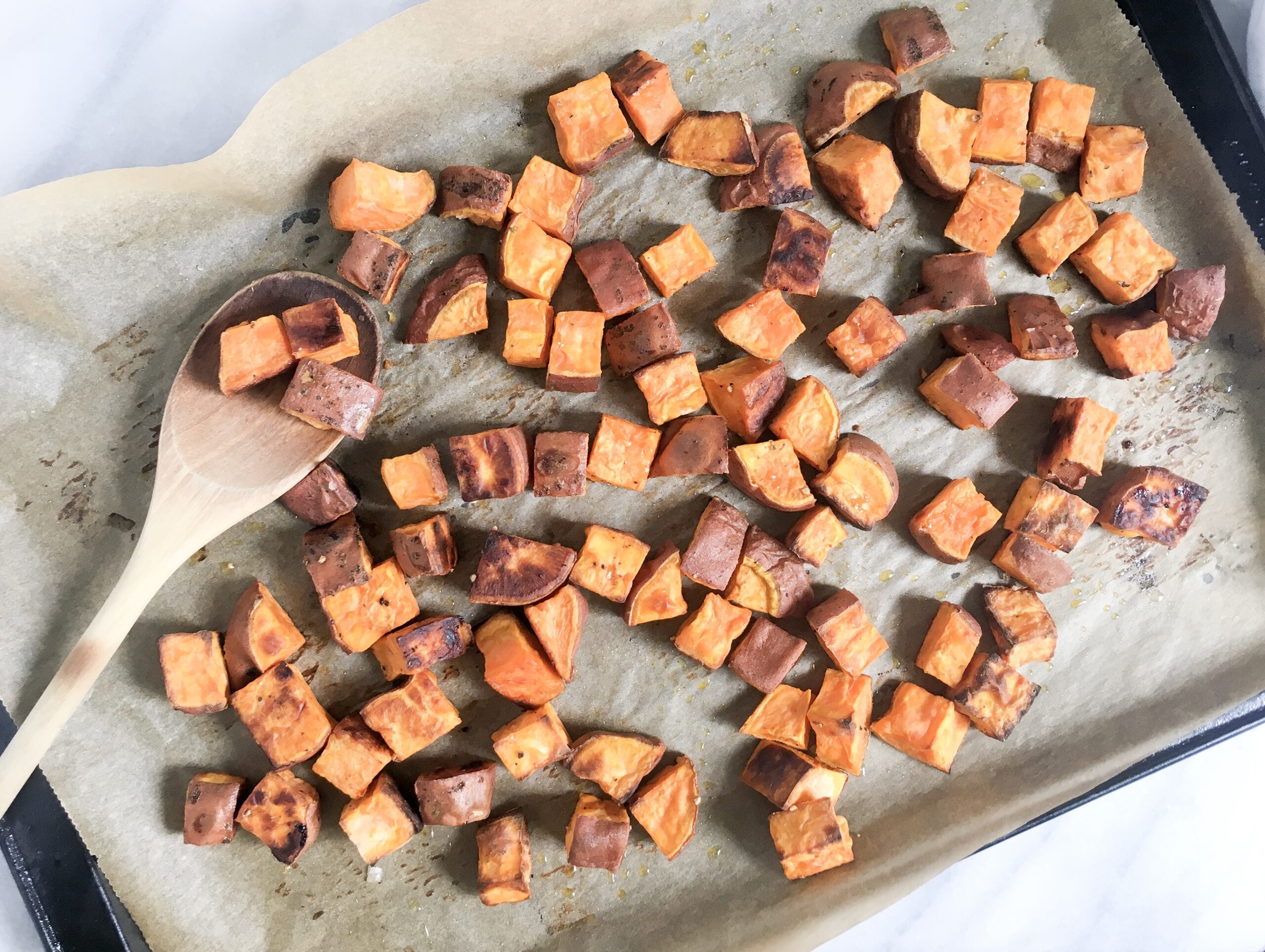 - Roast sweet potatoes for 30 minutes in the oven, until tender and slightly caramelized.